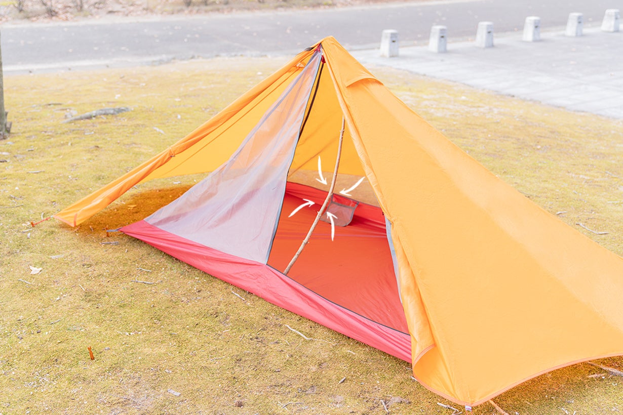 - 専用のポールがなくても登山に欠かせないトレッキングポールや木の棒などで組立が可能です。