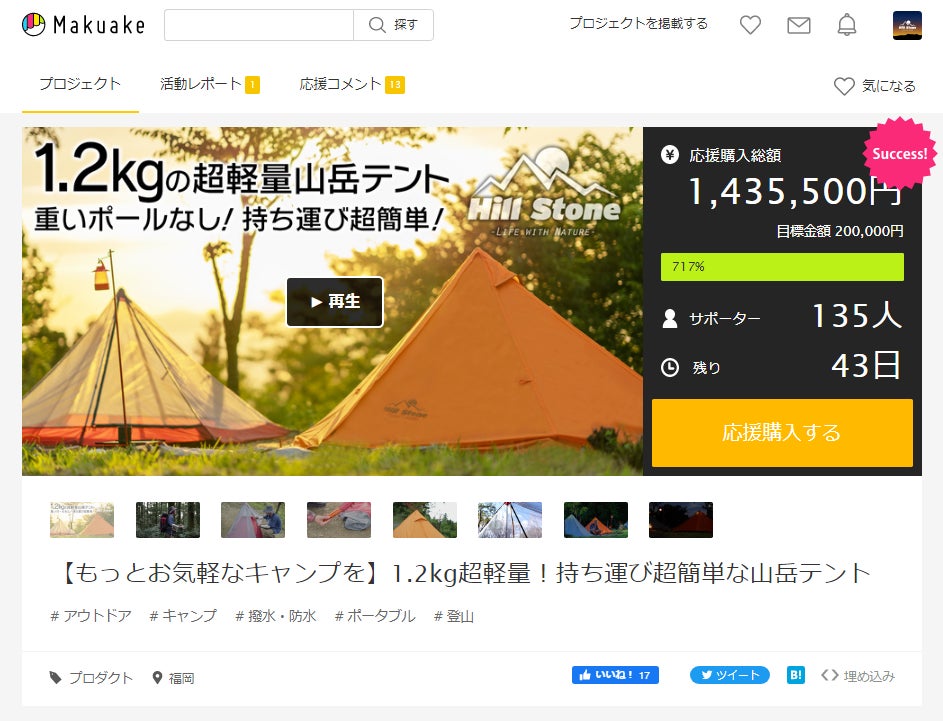 \Makuake公開初日から目標金額717%を達成/【もっとお気軽なキャンプを】1.2kg超軽量!持ち運び超簡単な山岳テント