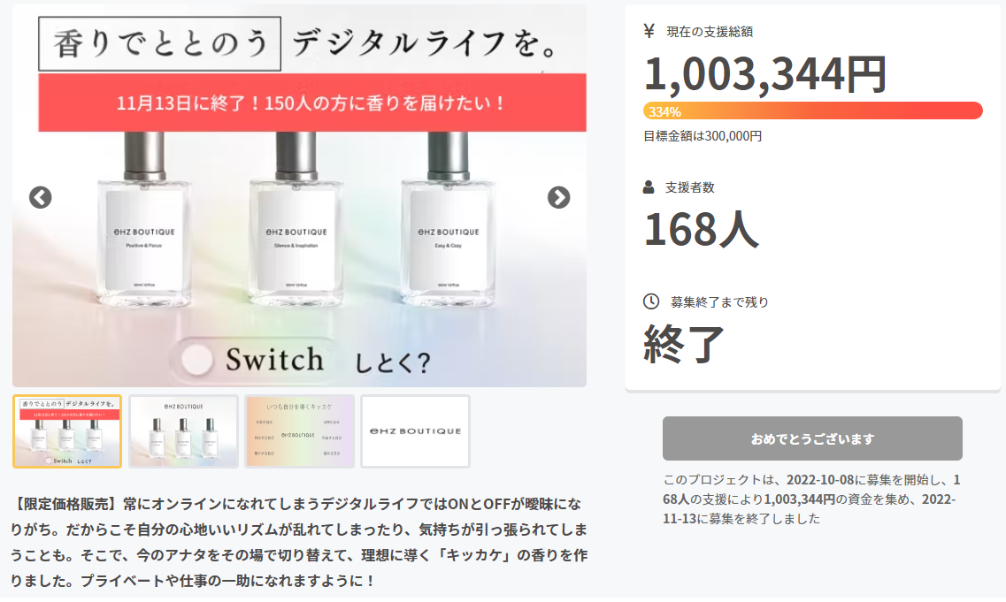 第一弾プロダクトとして「香りでON/OFFのスイッチ」をテーマにした、「エネルギースイッチ・ミスト(全3種)」を開発。10月8日(土)午前11時に公開したクラウドファンディングは、皆様からの温かいご支援により、開始後9時間で目標金額を達成いたしました。