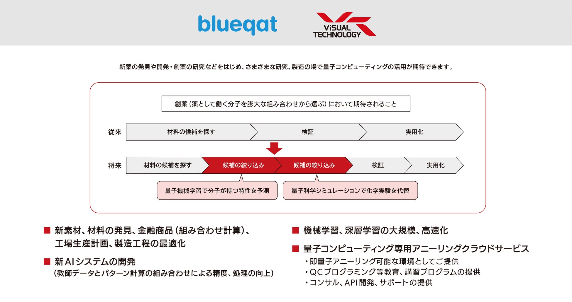 この展示会では、今後取り組んでいく量子コンピューティングサービス&プロダクトのご紹介およびデモンストレーションを行い、来場者の皆さまに量子コンピューティングについてわかりやすく解説します。また、blueqat社をはじめ量子コンピューティングサービスに取り組む複数の精鋭企業と提携して、量子アプリケーション、サービス、教育、アニーリングプロダクト等ユーザさまのニーズに合わせた全てのソリューションのご案内、ご提供が可能です。ビジュアルテクノロジー社は、これまでのコンピューティング経験を活かし、展示会では来場者と量子コンピューティング技術との橋渡し役としての役割を果たします。
