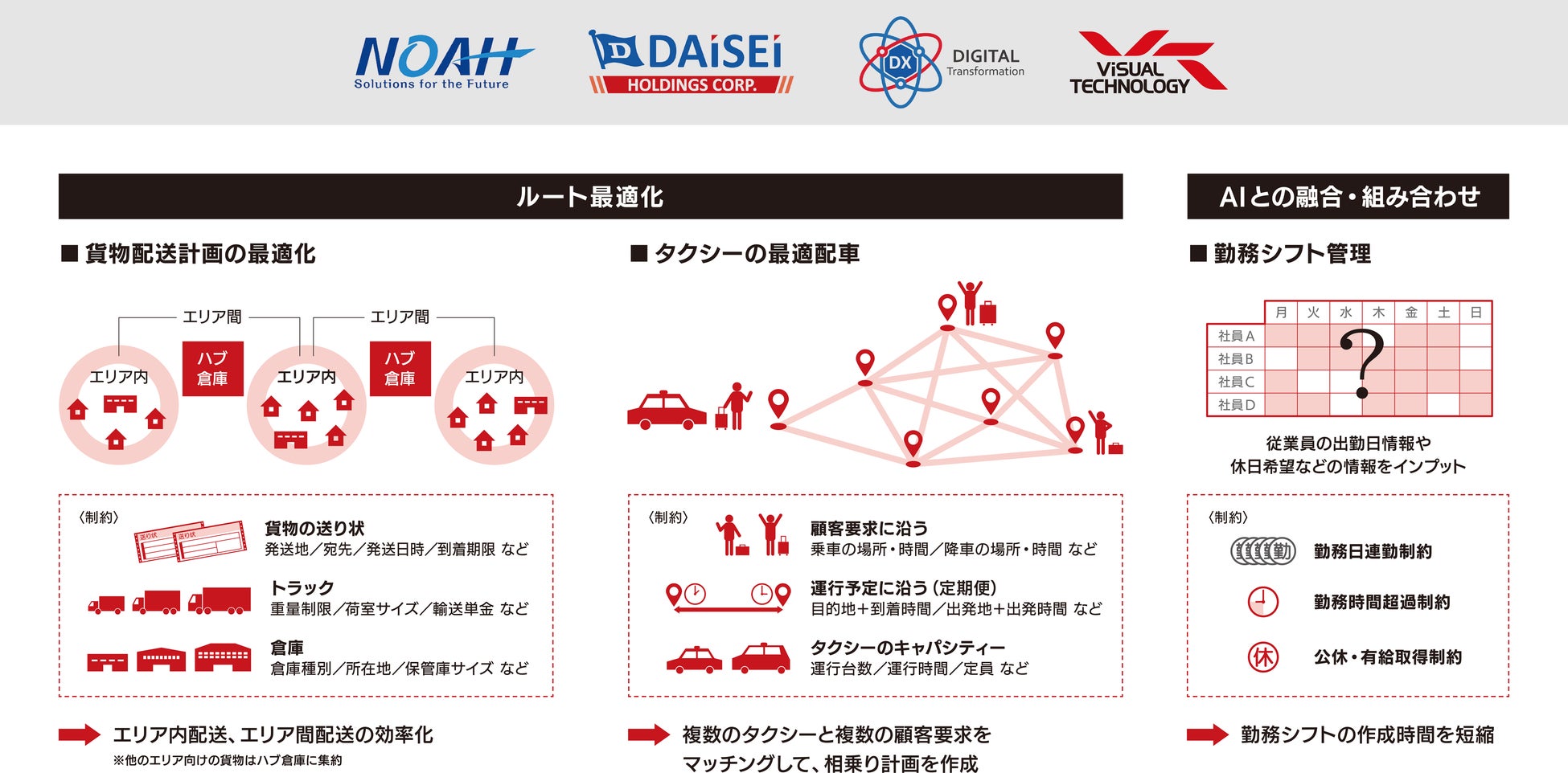貨物配送計画の最適化やタクシーの最適配車など、ルートの最適化に活用できます。AIとの組み合わせにより、勤務シフト管理も可能です。