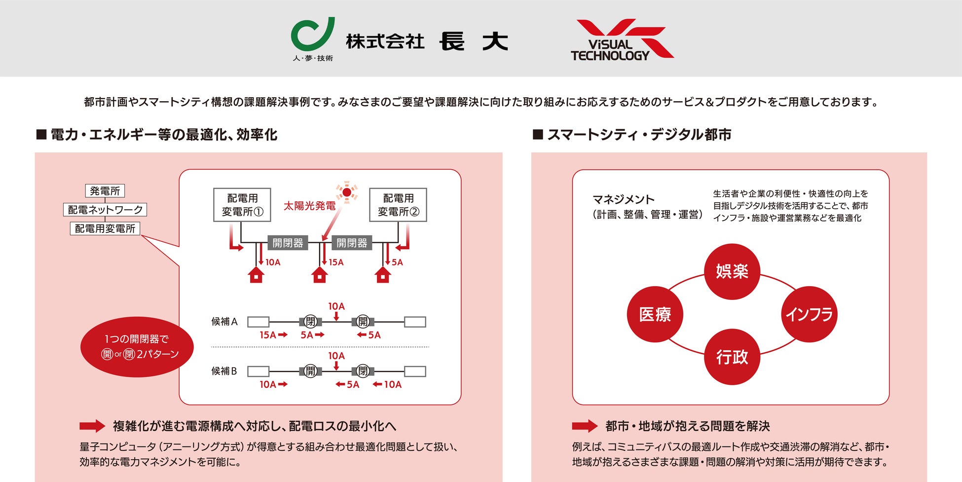 電力・エネルギーなどの最適化、効率化が実現可能です。電源構成は、量子コンピュータが得意とする組み合わせ最適化問題です。最適パターンを算出し、配電ロスの最小化が可能です。また、コミュニティバスの最適ルート作成などを通して都市・地域が抱える問題の解決が期待できます。