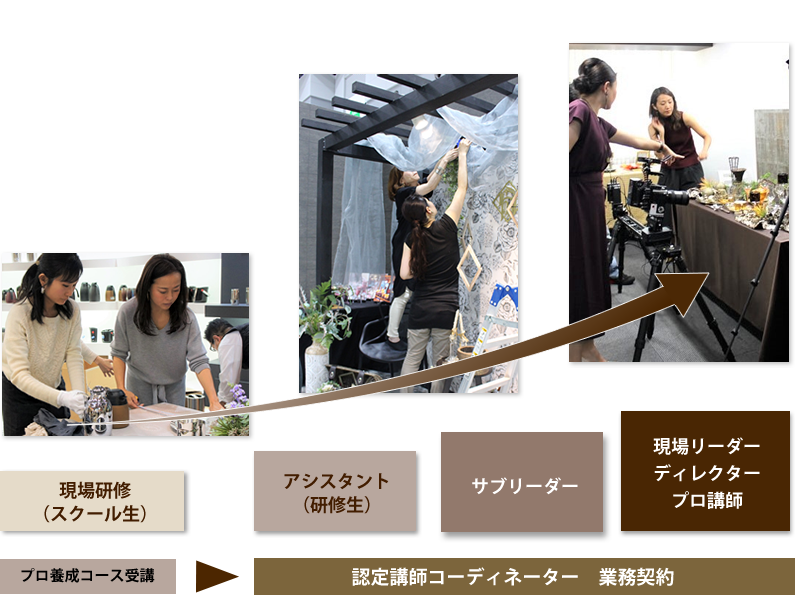 机上の概論や実習体験のみならず、実際の現場やお仕事を体験できる「研修制度」を充実させ、プロ養成講座後は、「FSPJ認定契約制度」を設けており、活動実績や経験を積んでいただきながら、個々のステップアップを継続的に応援しております。