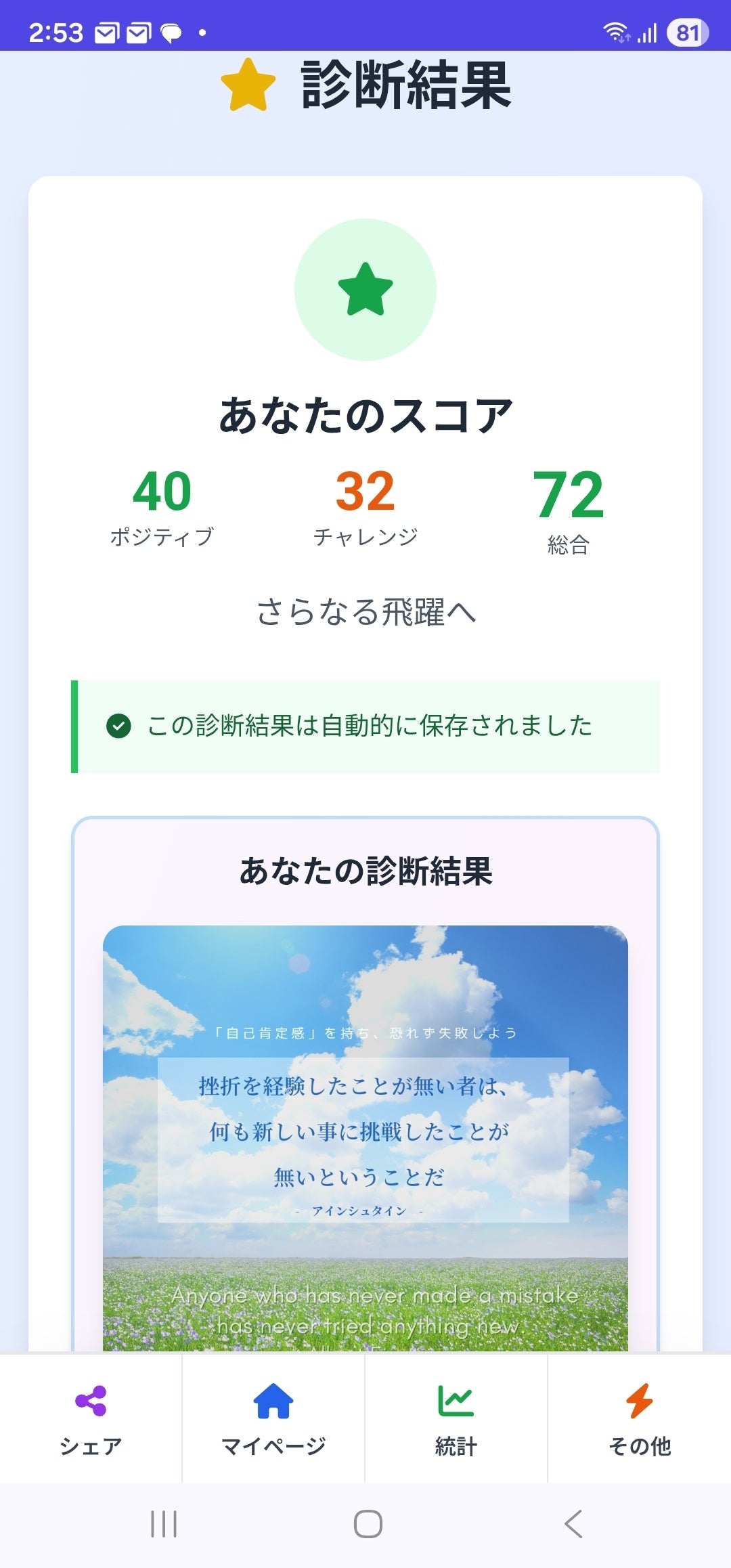 20問の診断で自己肯定感スコアを測定。定期的にチェックすることで、スコアの推移をグラフで確認できます。