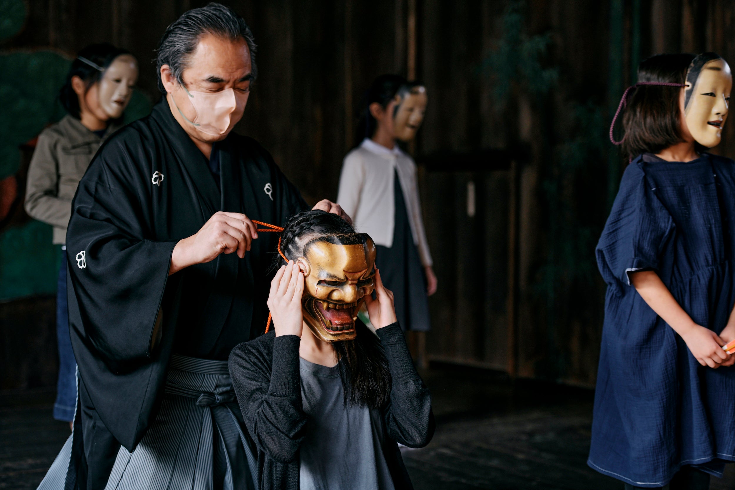 今年はさらに一歩を踏み込み、より深い体験を提供します。能面や鬘帯(かづらおび)に加え、風格ある子方用の装束に身を包み、日本の伝統と直接繋がる瞬間を味わうことができます。