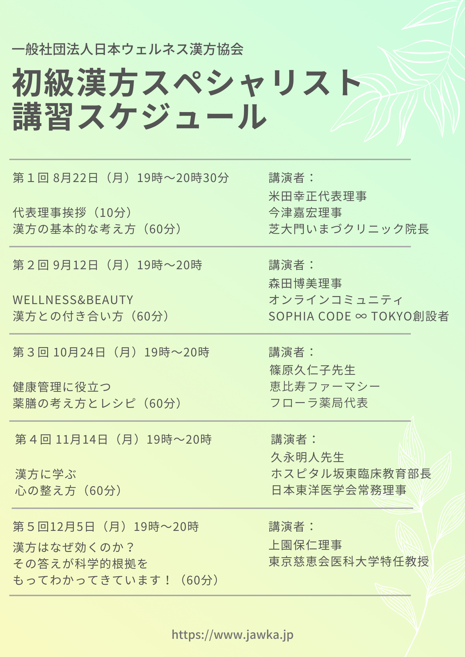【一般社団法人日本ウェルネス漢方協会発足】漢方の正しい知識を本格的に学んで生活に活かせる「漢方スペシャリスト検定」ベーシックコースが8月よりスタート