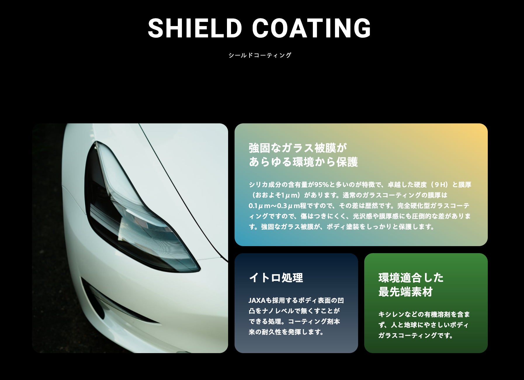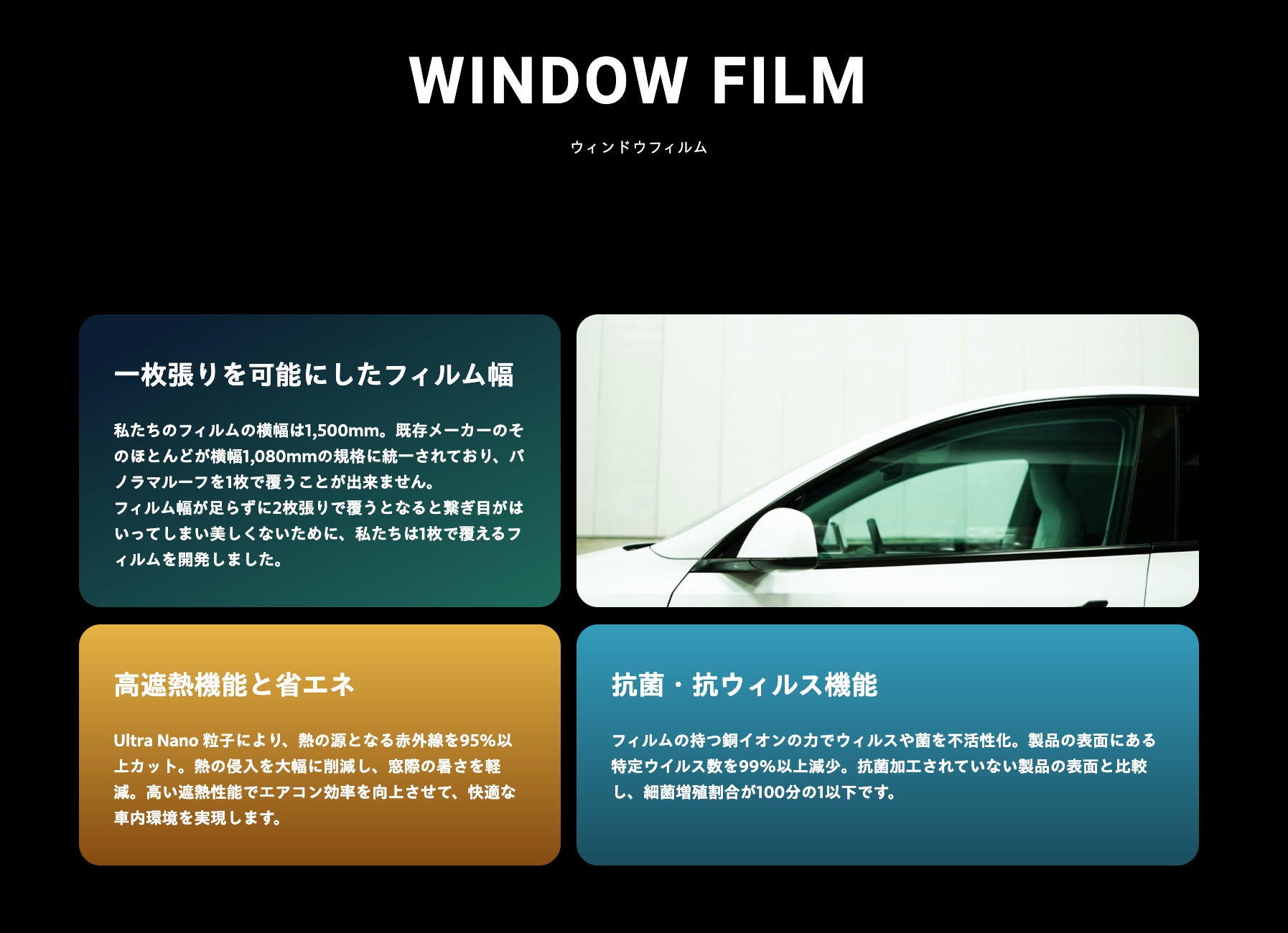 強固なガラス被膜があらゆる環境から保護するSHIELD COATING、モデルYも切れ目無く一枚張りを可能にしたWINDW FILMはテスラ専用オリジナルメニュー。