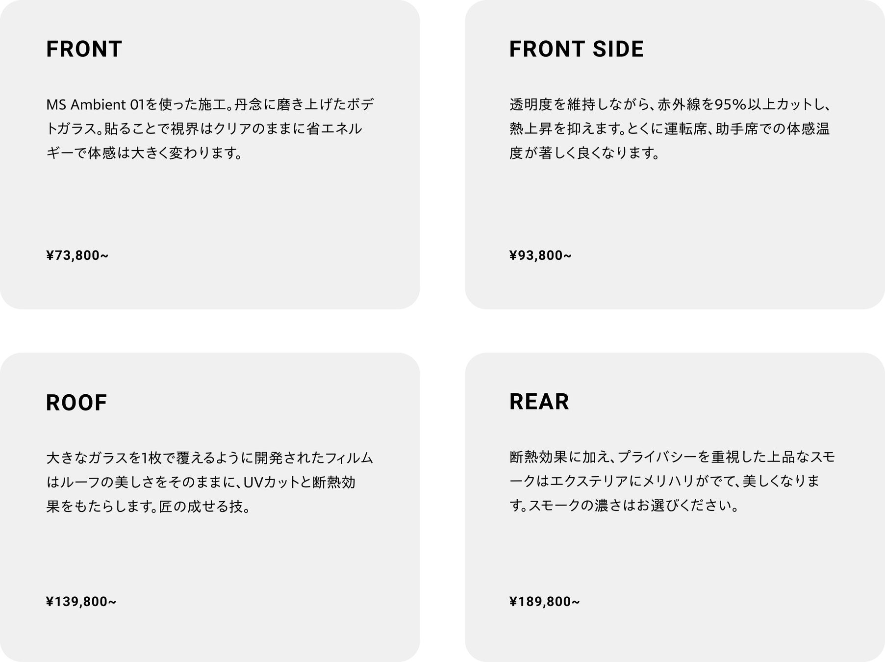 車内からの美しい景色をそのままに、高い遮熱性能で太陽のジリジリ感を和らげ、冷暖房効率を上げて省エネ効果が見込めます。外装はトーンが落ち着き、クールで美しい印象となり、快適な車内環境と外装の美しさ、その両方を手に入れられます。
