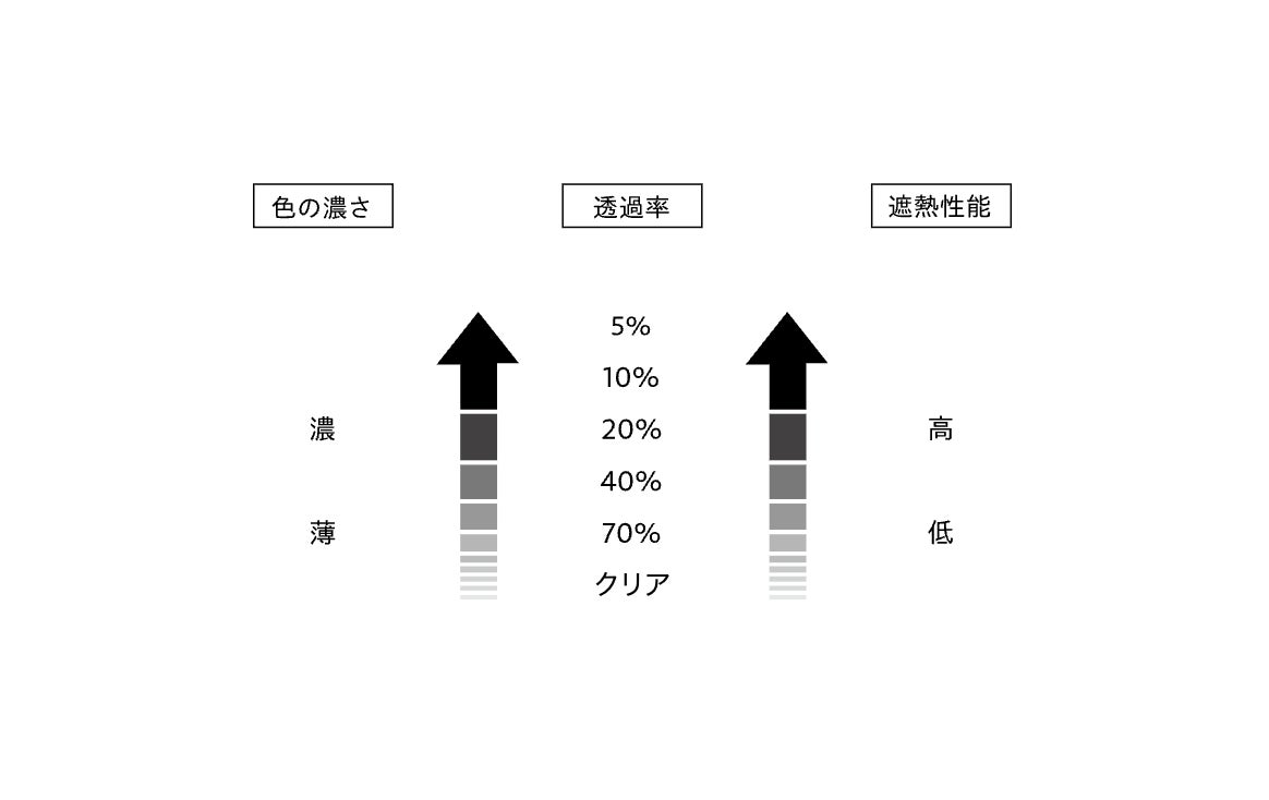 フィルムの濃度は、透過性、遮熱機能性に応じて好みに合わせてお選びいただくことができます。