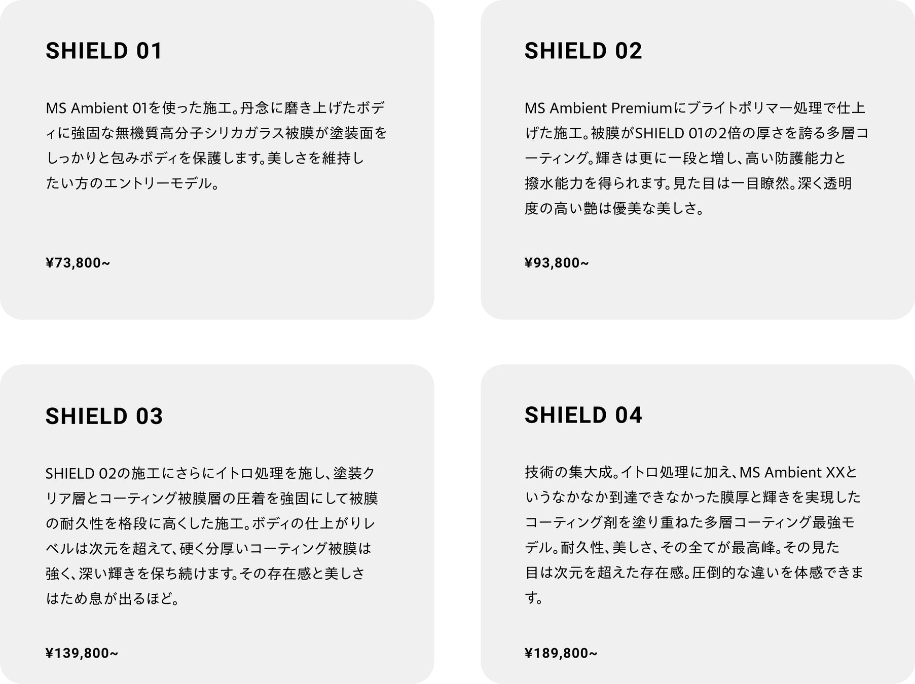 マーズクルーのシールドコーティングとは、ボディの素材、塗装システムを理解し、その特性や硬度にフィットするように作られた、オリジナルのテスラ専用のメニュー。