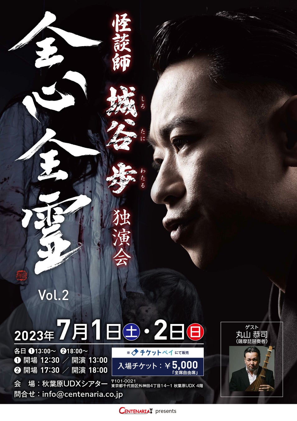 株式会社センテナリア(東京都新宿区、代表取締役:河合邦明)は、2023年7⽉1⽇(土)~2日(日)に秋葉原UDXシアターにて、怪談師城⾕歩の独演会「全⼼全霊 Vol.2」を主催することを決定いたしました。