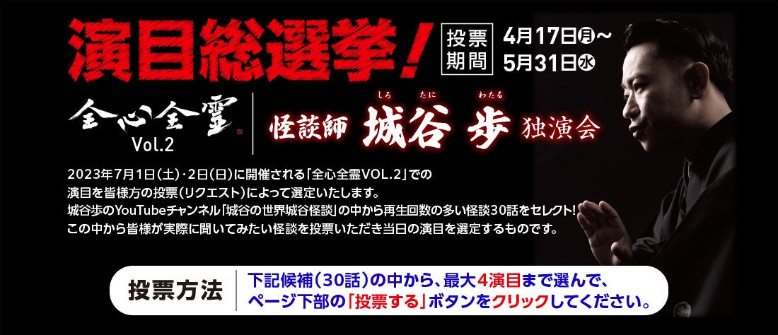 下記投票ページには城谷歩のYouTubeチャンネル「城谷の世界 城谷怪談」の中で再生回数の多い30話がセレクトされています。その中からお一人様4票まで投票できるようになっています。是非ご参加ください!