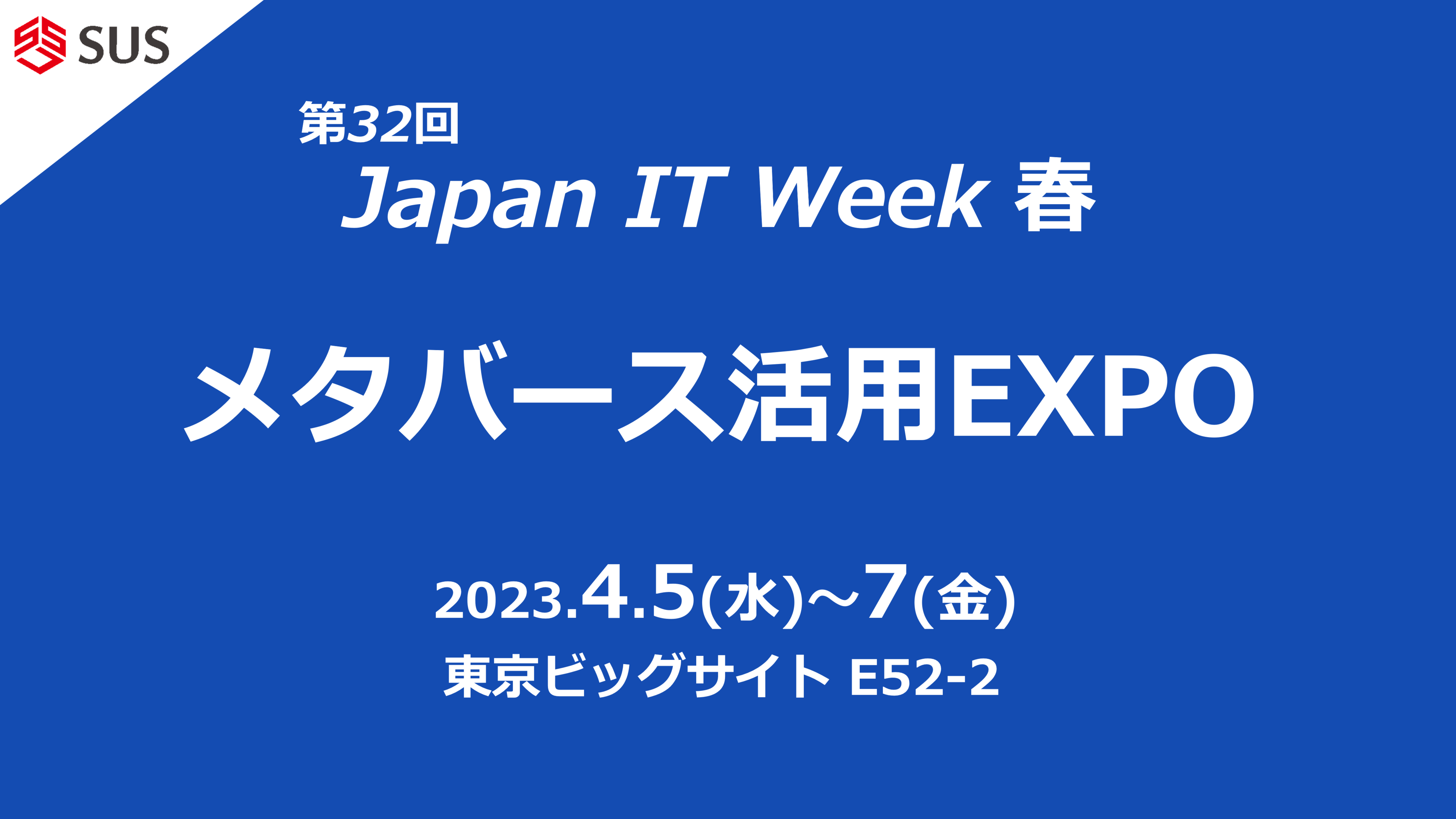 株式会社エスユーエス(本社:京都市下京区、代表取締役社長:齋藤 公男)は、2023/4/5(水)~7(金)に東京ビッグサイトで開催される日本最大級のIT展示会「第32回Japan IT Week 春」内の「メタバース活用EXPO」へ出展いたします。(出展ブース番号:E52-2)
