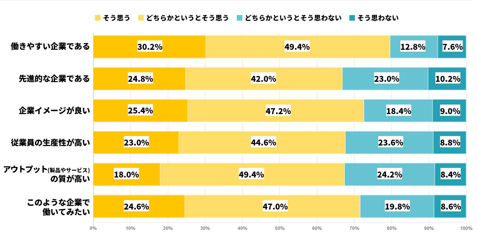 次に、『昼寝スペース』や『仮眠スペース』を従業員のために用意している会社に対してどのような印象を持っているか質問しました。結果、「働きやすい企業である」「先進的な企業である」「企業イメージが良い」「従業員の生産性が高い」「アウトプット(製品やサービス)の質が高い」「このような企業で働いてみたい」の全てにおいて、「そう思う」「どちらかというとそう思う」の合計が約7割という高い結果となりました。