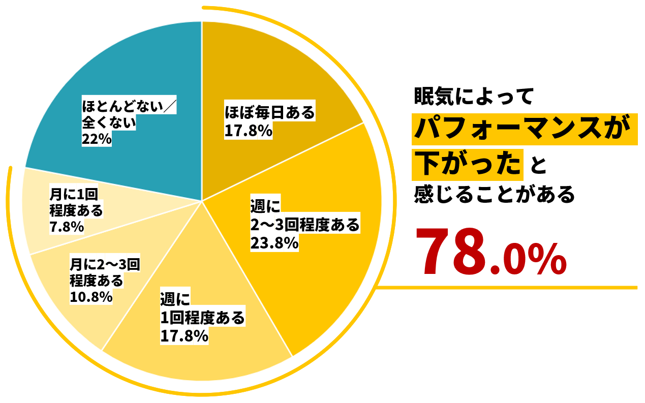 | 約8割の人が月に1回以上眠気を感じているだけでなく、それによって「仕事の質や効率が下がった」と感じていることがわかります。 |