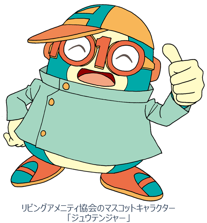 「ジュウテンジャー」は、皆さまの安全で快適な暮らしを見守るために生まれた、リビングアメニティ協会のマスコットキャラクターです。日本全国を飛び回って、住宅部品のお手入れや点検を応援しています。誕生日は住宅部品点検の日の10月10日で、機敏でおちゃめな性格です。