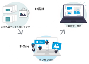 お客様が気軽に「教材作成、比較研究および展示企画」ができるシステムを目指し「クラウド版IT-One Quest」を開発中です。クラウド版IT-One Questは、WEBブラウザからのアクセスを可能とし、お手持ちのデジタルコンテンツの登録や表示順の設定をお客様自身で行っていただくことが可能となります。