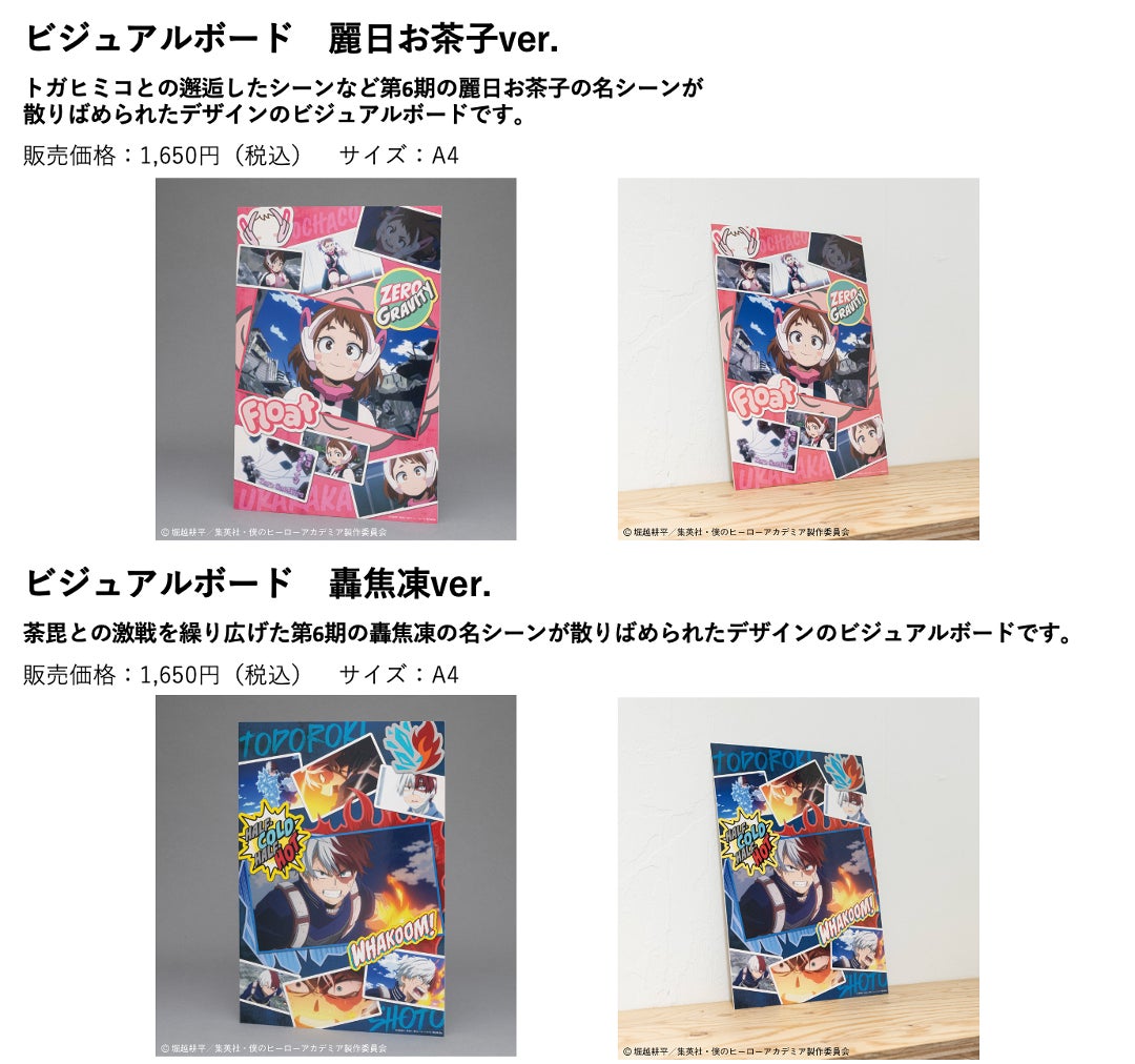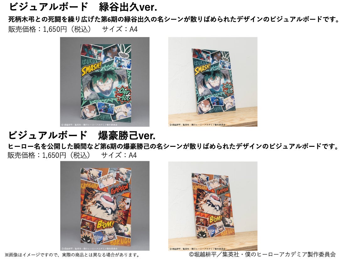 熊<べあ>のヒーローアカデミアは、ヒロアカの人気キャラクターたちをイメージしたくまのぬいぐるみです。各キャラクターの特徴や衣装などを細部まで再現。更に両足にはキャラクターをイメージしたアイコンと“個性”名が刺繍されています。「緑谷出久ver.」、「爆豪勝己ver.」、「麗日お茶子ver.」、「轟焦凍ver.」、「オールマイトver.」の全5種類のラインナップです。他にもアニメ第6期の名シーンが散りばめられたビジュアルボードやマットな質感が特徴のマット缶バッジコレクションなどファン必見の商品が目白押しです。