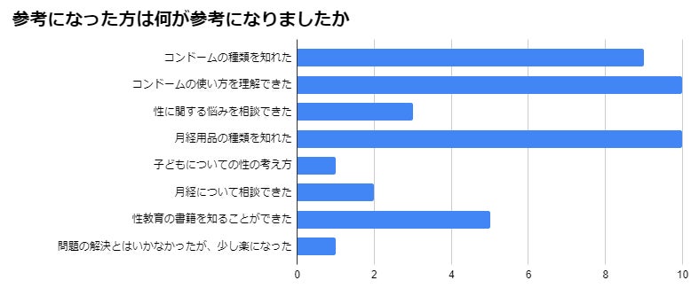 また、今回のようなスポット開催は、月経用品やコンドーム、書籍の紹介や使い方指導等に興味を示していただきやすいものの、より深い悩みを相談してもらうためには定期的なユースカフェの開催の必要性を改めて感じています。