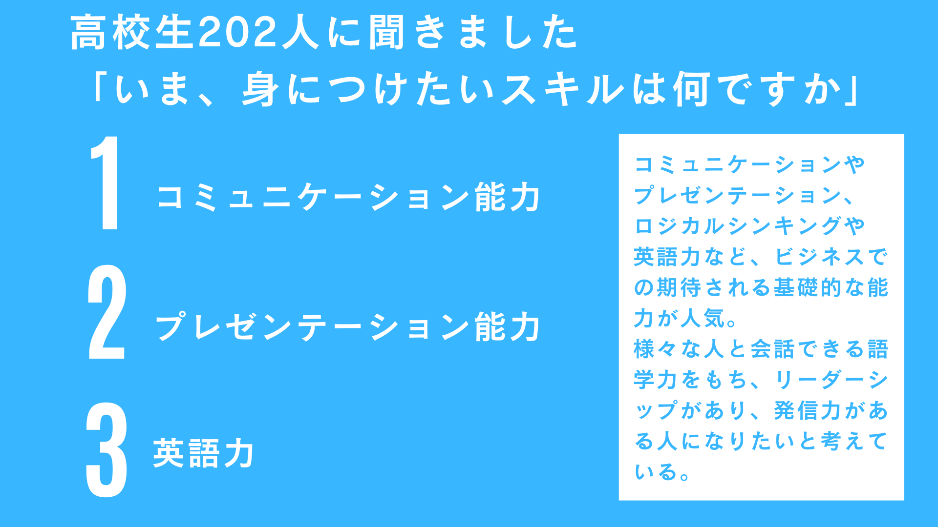 高校生のうちに身につけたいスキルは、リーダーになったときにチームをしっかりとまとめて成長させていけるようなコミュニケーション能力です。学級委員長を務めているのですが、意見をうまくまとめられなかったり、問題が起きたときに対処できなくて、結局先生に任せきりになってしまうことがあります。大人になってからもリーダーとして周りの人を引っ張っていくという経験はあると思うので、今のうちにできるようになっておきたいです。