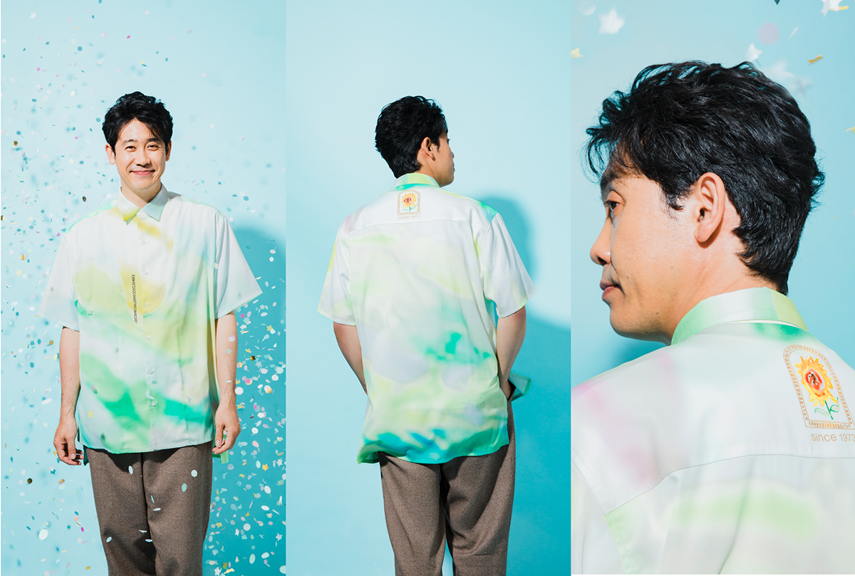 背面の首元には大泉が描いた「ひまわり」の絵がプリントされています。歩み続けて50年。あの時の道に今も、ハナは咲く。