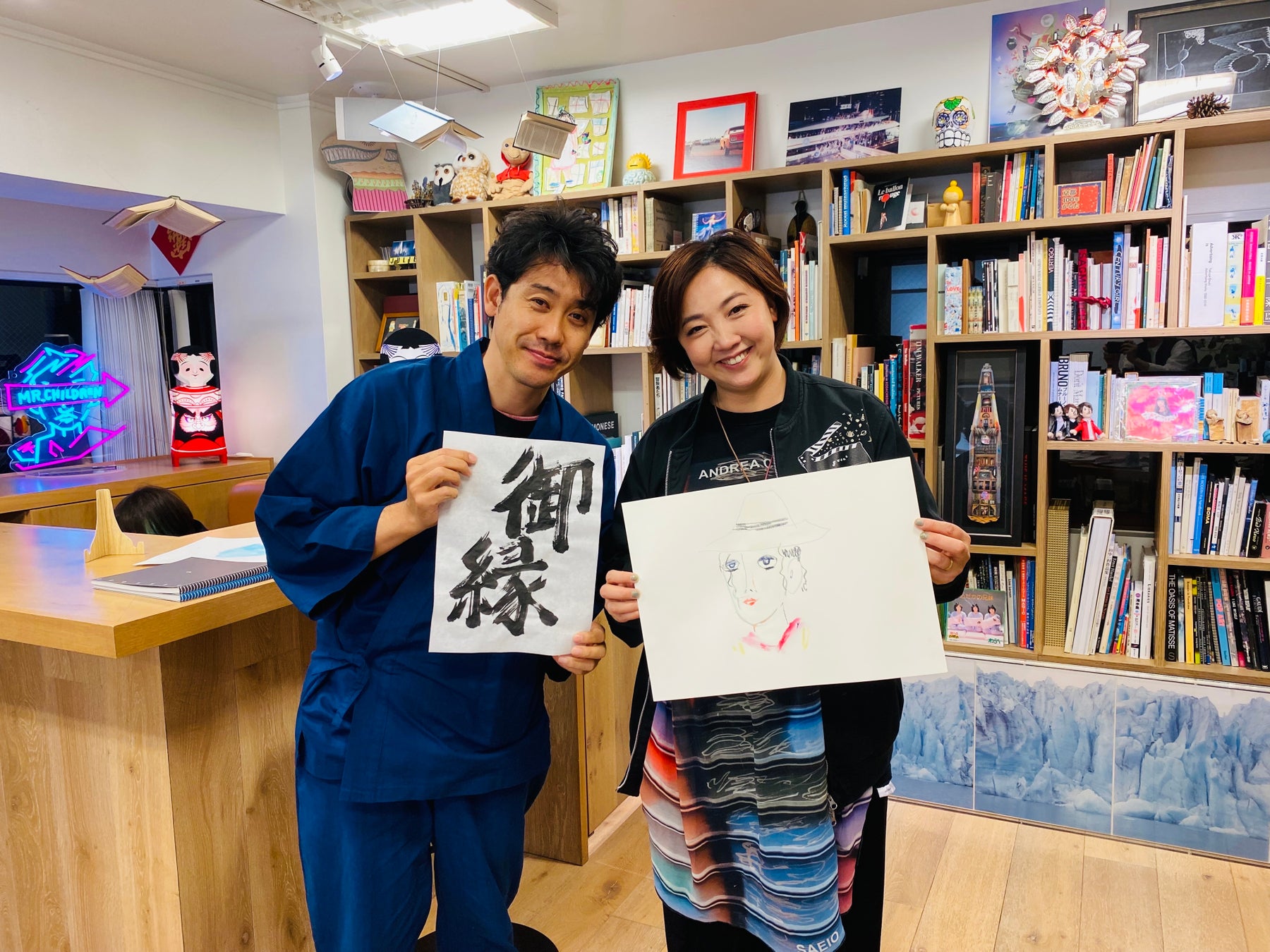 取り扱い商品は、森本さんがデザインし大泉が描いた絵や書がプリントされたアートシャツ3種、アートシャツのデザインを再構築したスカーフ3種、「大泉フィフティー曼荼羅」がフロントにプリントされたTシャツ2種の計8アイテム。オンラインショップキュープロ( https://cuepro.office-cue.com/ )での予約販売となります。