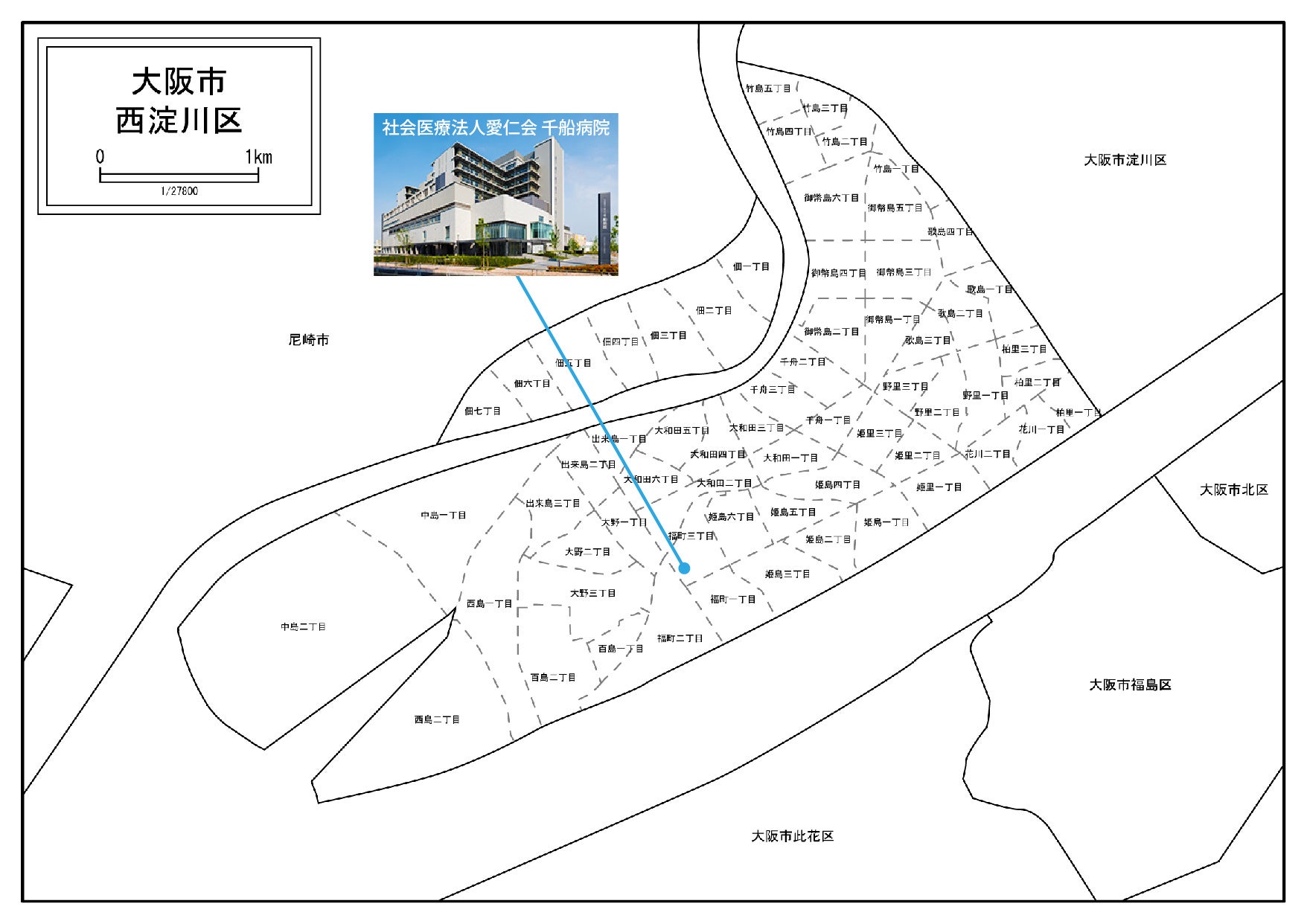 当院が所在する大阪市西淀川区は、大阪市の北西部に位置し、三方向を大阪湾、淀川、神崎川などの川に囲まれており、北側は兵庫県尼崎市と接しています。また、西淀川区は、2025年に区制100周年の節目を迎えます。