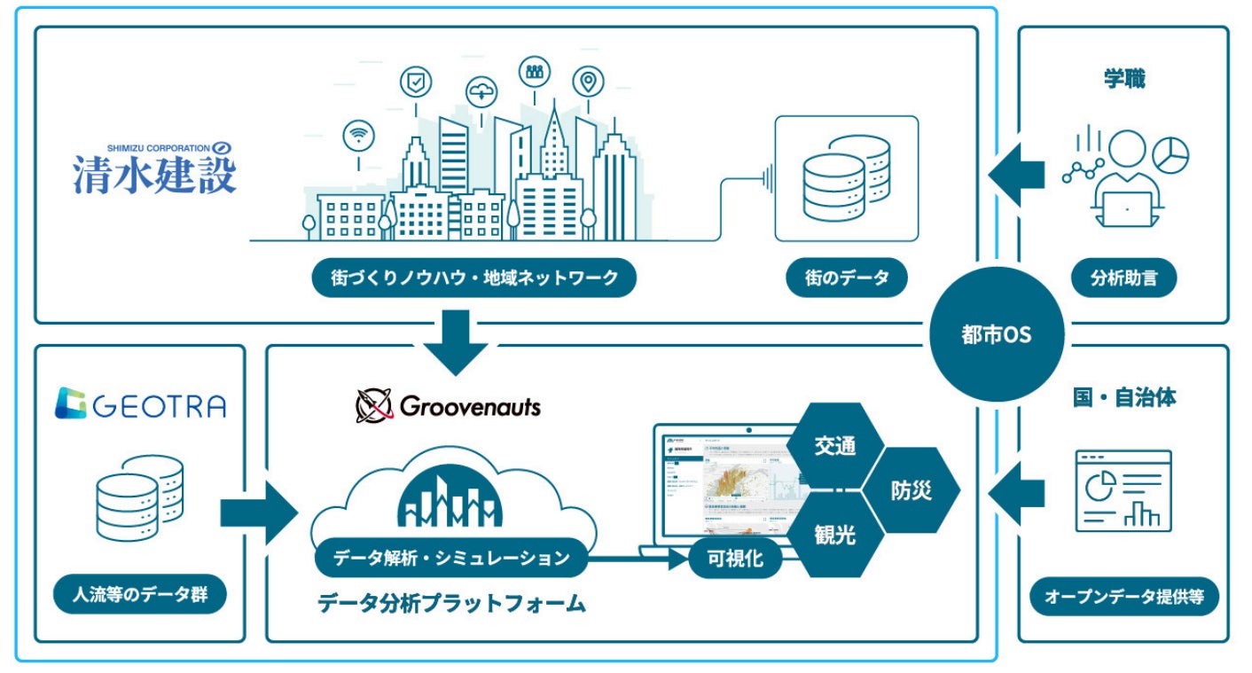 株式会社GEOTRA(本社:東京都千代田区、代表取締役社長:陣内寛大、以下GEOTRA)と清水建設株式会社(本社:東京都中央区、代表取締役社長:井上和幸、以下清水建設)、株式会社グルーヴノーツ(本社:福岡県福岡市、代表取締役社長:最首英裕、以下グルーヴノーツ)は、位置情報などのビッグデータと先端テクノロジーによるシミュレーション技術を掛け合わせて、交通・防災・観光の最適化を図るためのデータ分析プラットフォームの開発に着手しました。