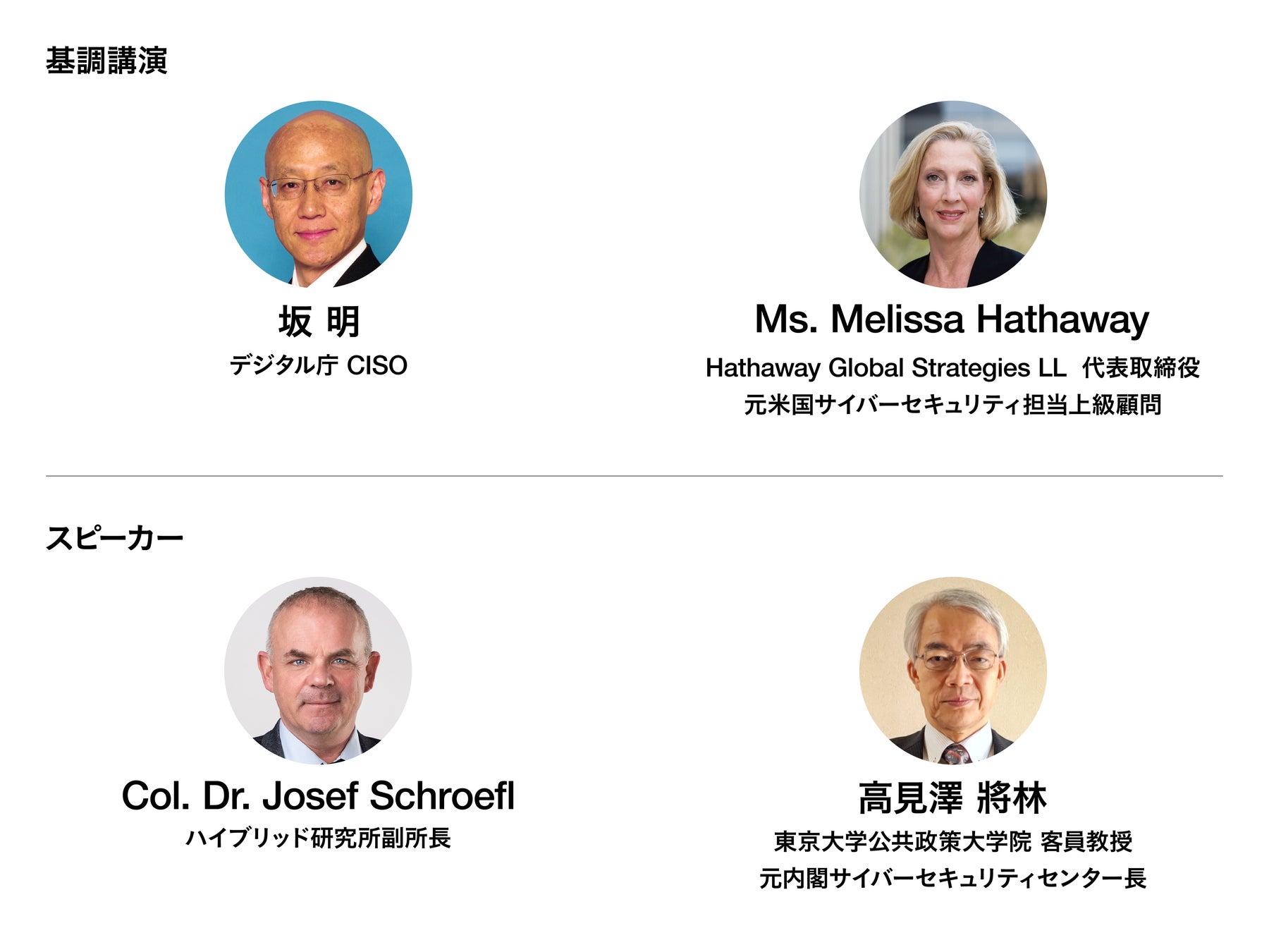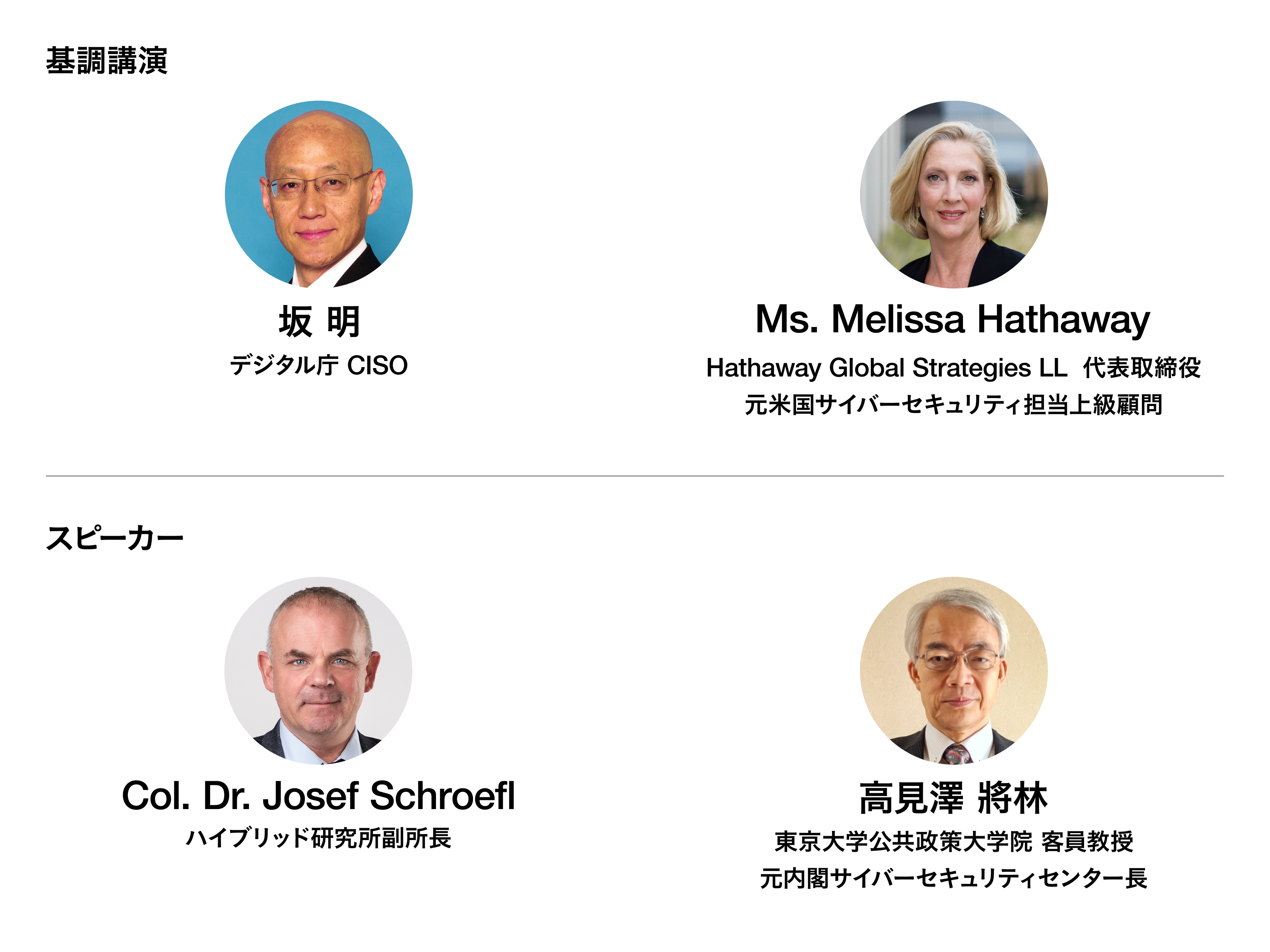 今回のCYDEF2022では基調講演に日本からデジタル庁CISOの坂明氏、海外からMs, Melissa Hatheway氏にご登壇いただくことなりました。また、スピーカーとして国内から東京大学公共政策大学院 客員教授 高見澤將林氏、Center of Excellence for Countering Hybrid Threats のJosef Schroefl氏にもご登壇いただくことが決定しました。全スピーカーは10月下旬には決定し公表いたします。
