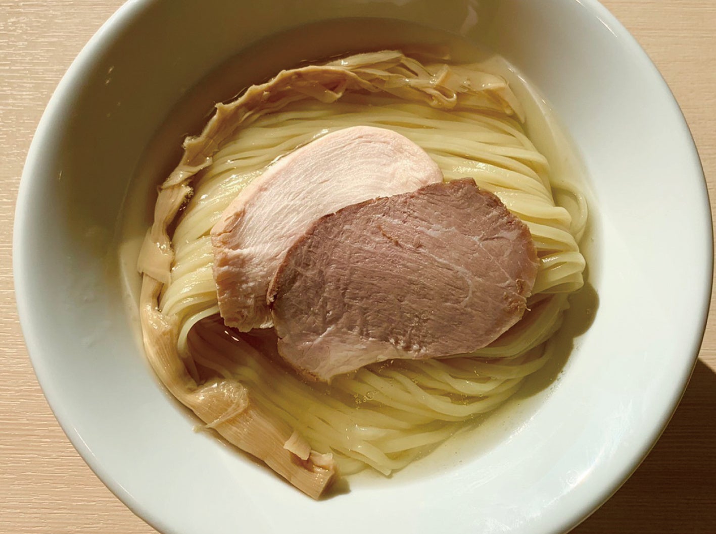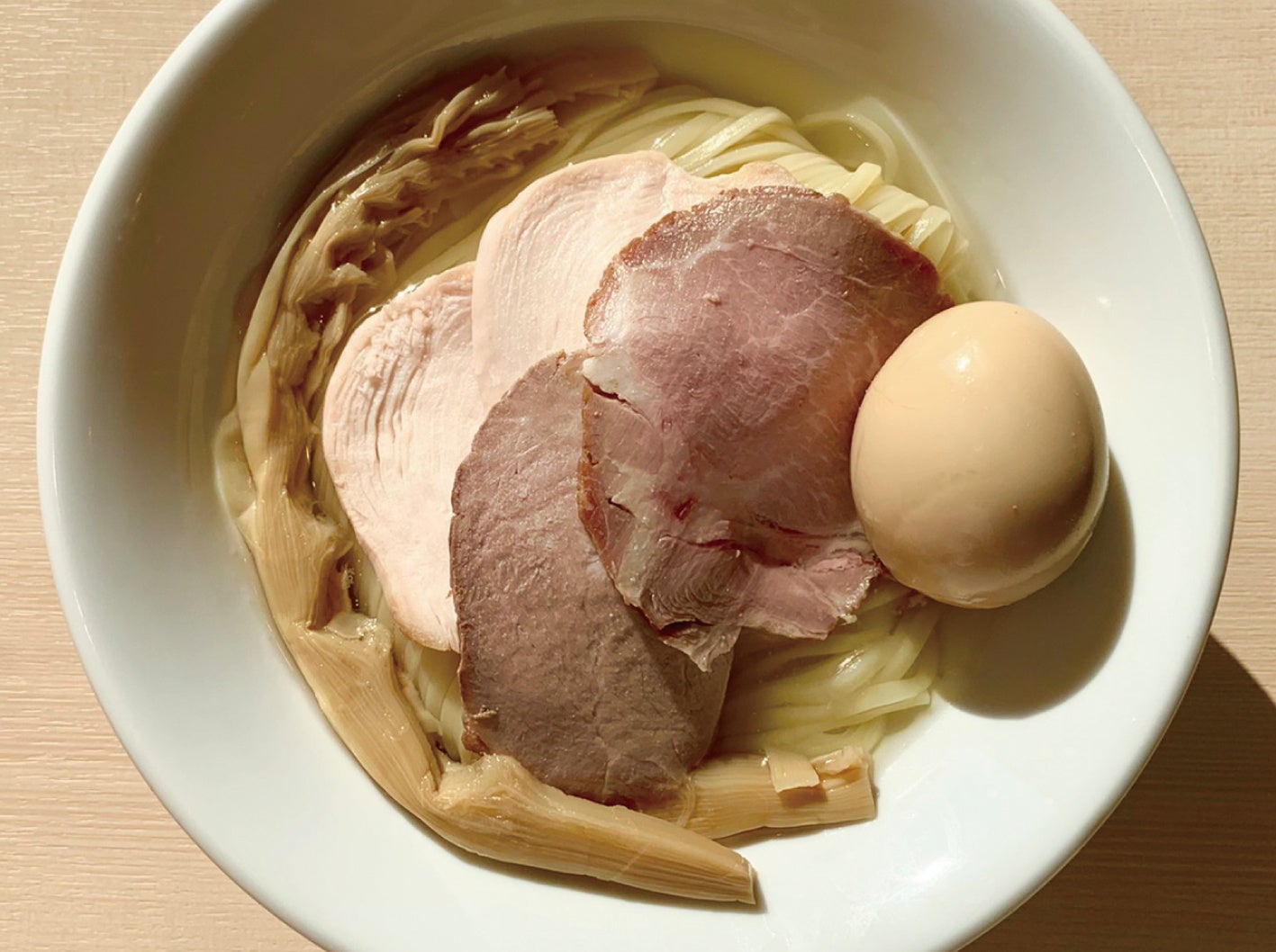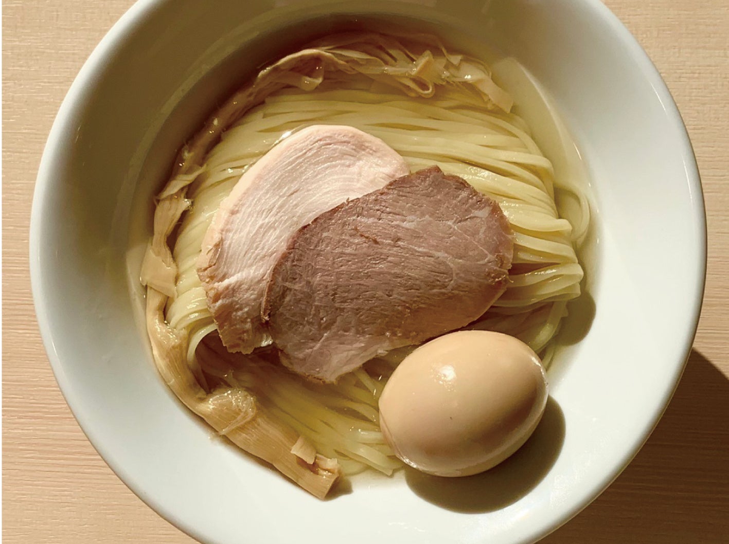 同じく新宿で⾼い⼈気を誇る「煮⼲中華そば鈴蘭」の流れをくむ「らぁ麺はやし⽥」は、鴨ガラと⼤⼭どりを丸のまま使った透き通るような醤油スープが代名詞。