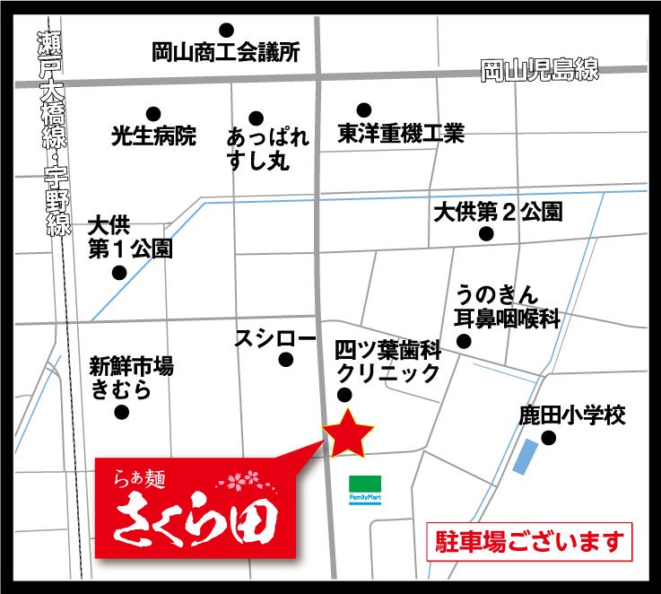 JR岡⼭駅と⼤元駅の中ほどに位置し、島⽥筋沿いに複数台駐⾞可能なパーキングを備えて「らぁ麺さくら⽥」としてグランドオープンいたします。
