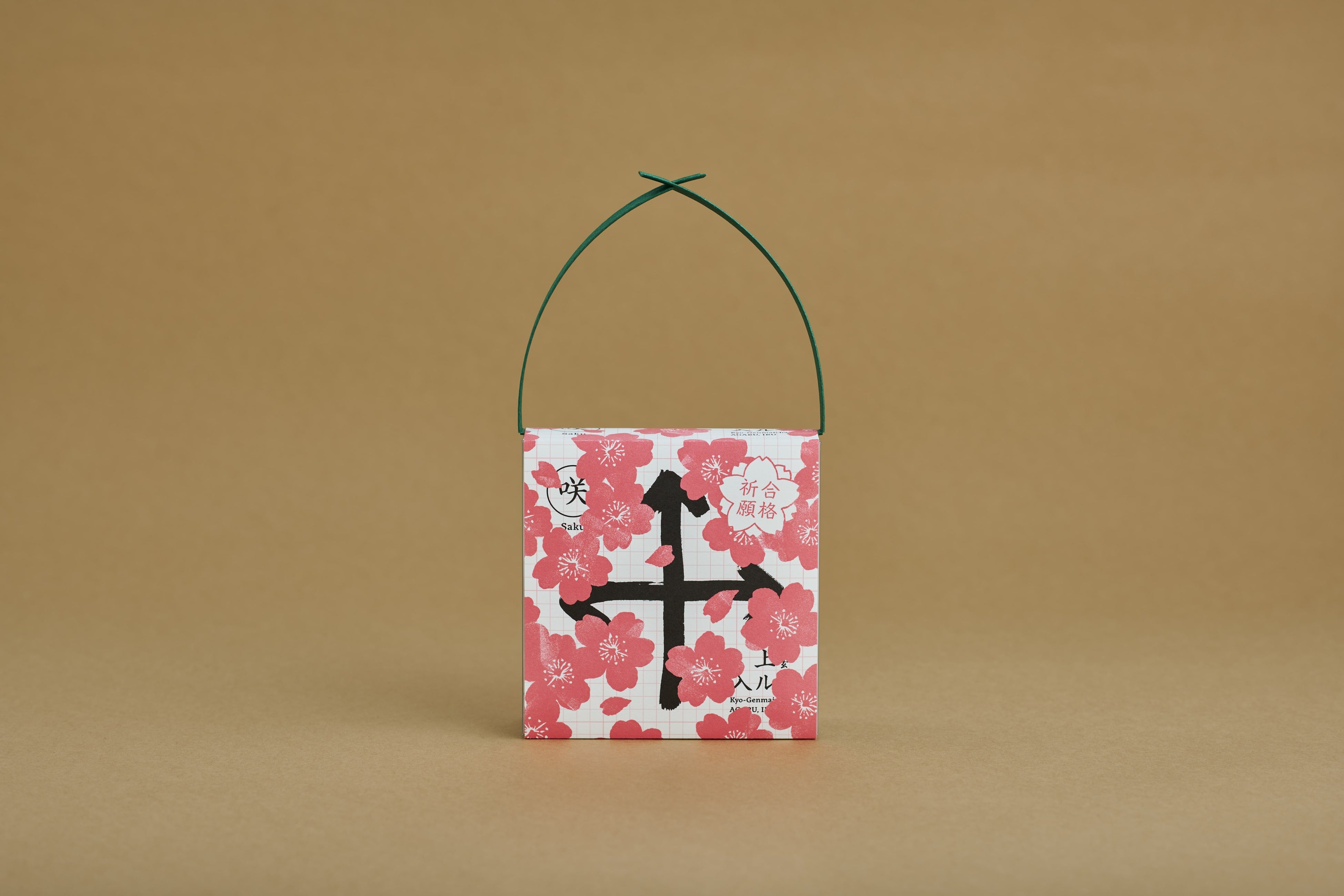 「京玄米茶 上ル入ル」という商品名には「上ル」「入ル」と縁起のよい言葉がふたつも含まれています。 元々縁起のいい商品名をきっかけに、そこにさらに塩漬けの桜花を組み合わせることで「成績が上ル、志望校に入ル、サクラサク」という、全国の受験生に向けた特別応援茶をつくれないか、と考えて生まれたのが「京玄米茶 上ル入ル【桜茶】」です。桜は縁起のよい花とされ、咲き始めの時は「生命力」や「未来」を象徴し、満開になると「繁栄」や「発展」を象徴するといわれています。あざやかな緑色のお茶のなかで、ゆっくりと桜の花びらが開いていく様子はまさに〝サクラサク〟。勉強の合間に、玄米茶でほっと一息リラックス。飲めば気持ちも晴れやかに、あなたの未来が花開きますように。 そんな想いを込めて、春よりひと足先にご用意した特別応援茶になっております。