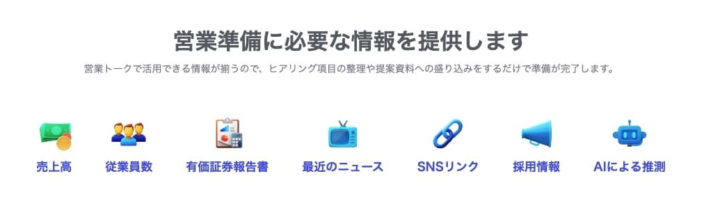 提供されるデータは、営業に役立つ情報が短時間で把握できるように構成されています。例えば有価証券報告書のデータは、営業トークや提案に有用な箇所をワンクリックで表示できるため、忙しい方でも短時間でご活用頂けます。