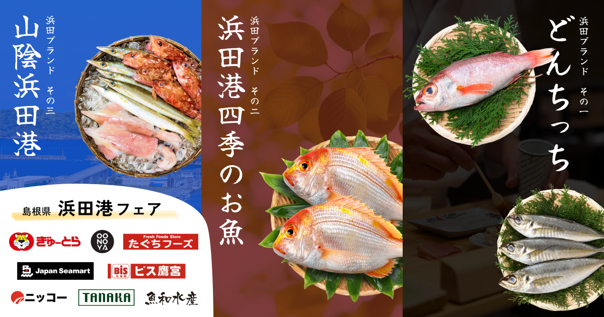 「浜田港フェア」と銘打ち、スーパーマーケット・小売店様8社28店舗におきまして、盛大に島根県山陰浜田港水揚げの新鮮でおいしいお魚を販売していただきました。フェアでは多くのお客様にお買い求めいただき、大盛況のうちに終了しました。浜田の水産物ブランドや浜田市自体の認知度向上につながるフェアを開催していただき、大変うれしく思います。今後も、浜田の水産物ブランドをはじめとした「海の幸」を全国のみなさまにご賞味いただければ幸いです。