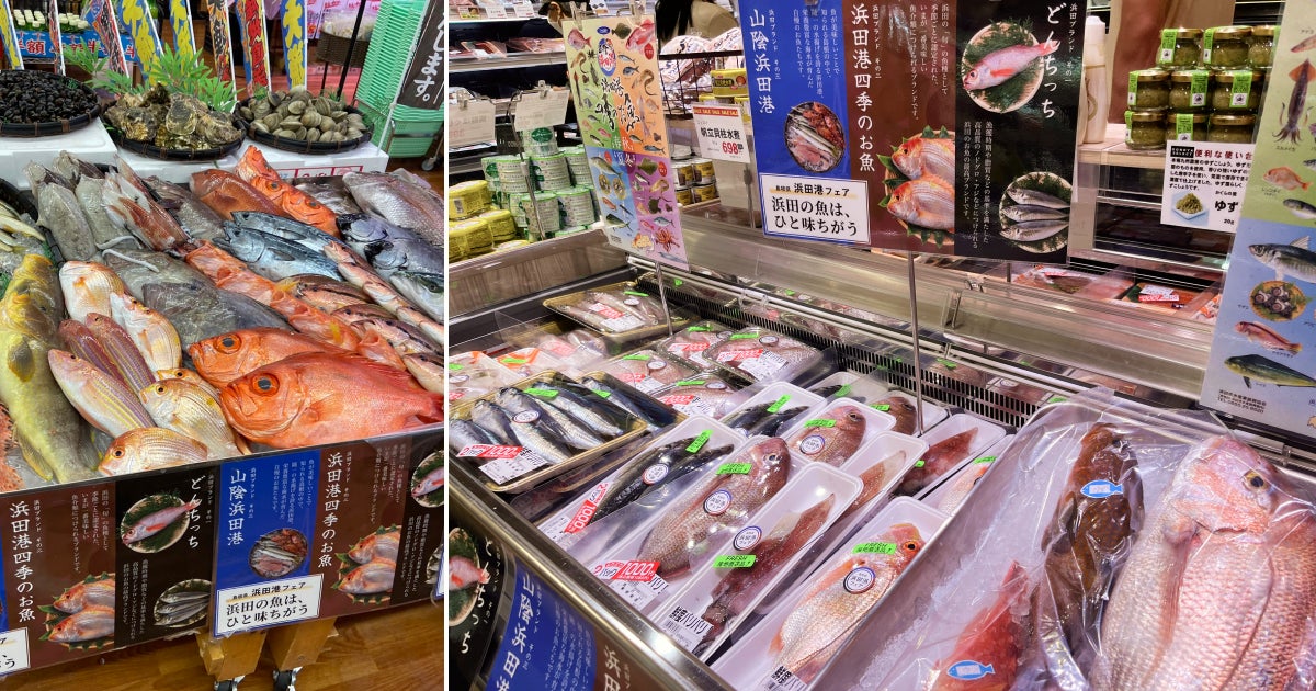みらいマルシェが提供する「産地フェア応援プロジェクト」の一環として、はまだ産業振興機構(島根県浜田市)の後援のもと、関東・関西・東海エリアの食品スーパー及び鮮魚小売店8社・28店舗で開催され、浜田港で水揚げされた鮮魚約40種、および水産加工品1種が取り扱われました。