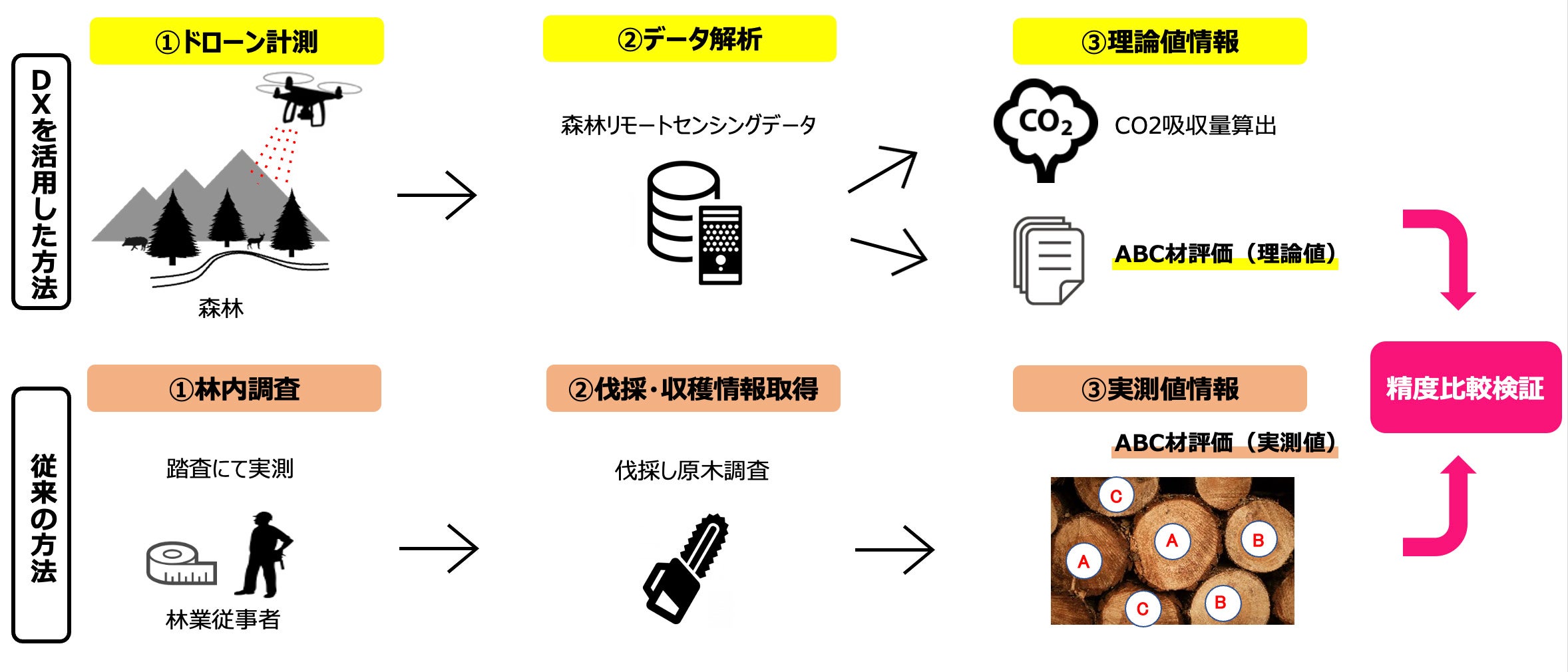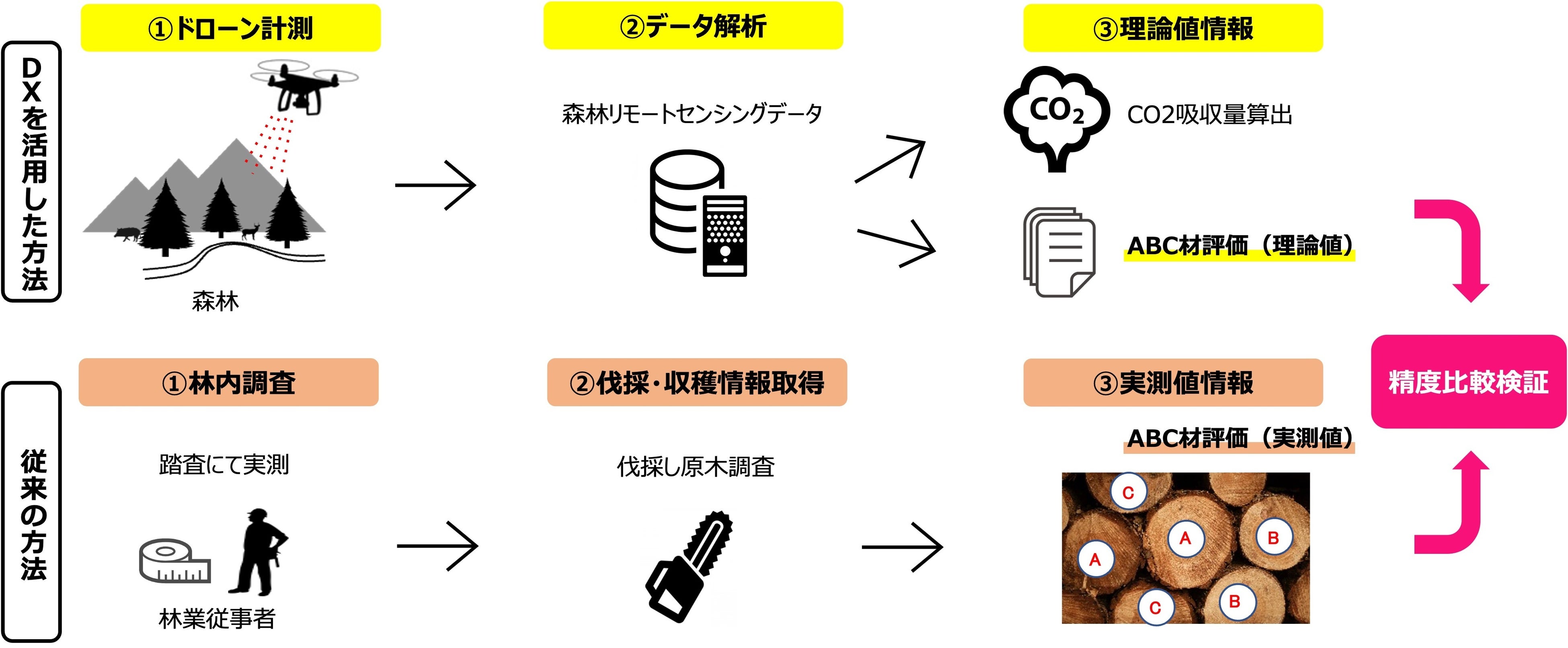 林業では、低い労働生産性や木材価格の低迷が大きな課題となっており、林業DX等による森林資源管理や生産管理の効率化、木材の高付加価値化が重要になっています。本実証では、徳島県神山町の森林約15haにおいて、リモートセンシング技術を活用したドローン計測によって取得した高精度な「森林デジタル情報(ABC材情報)」と同計測エリアで実際に伐採された「原木収穫情報(ABC材情報)」を比較することで精度検証を行い、森林デジタル情報を活用した立木状態での森林(木材)在庫の見える化(≒森林価値の見える化)を目指していきます。これが実現すれば森林資源管理や生産管理の効率化、木材の高付加価値化が期待され、また同データを活用することで、副次的に森林のCO2吸収量を正確に算定することが可能になり、森林カーボンクレジットの創出等、新たな森林価値を生み出し、カーボンニュートラル社会の実現へ貢献していきます。