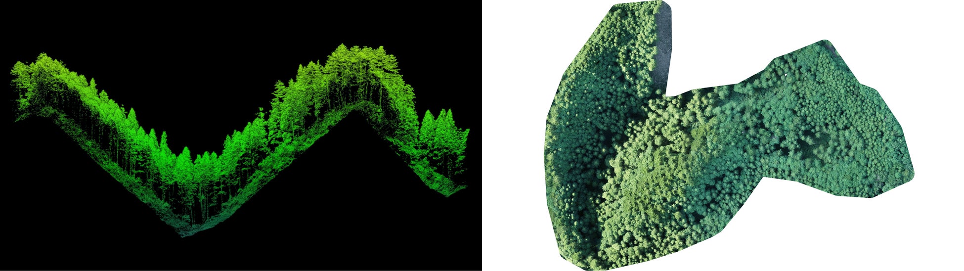 ※本実証実験は、2023年11月1日に徳島県神山町の森林2か所(約15ha)においてドローン計測を行い、その後、2023年11月~2024年1月にかけて計測場所の森林を伐採し、実際の丸太の状況とドローン計測により得られた解析結果との突合せによる精度比較検証を行う予定です。