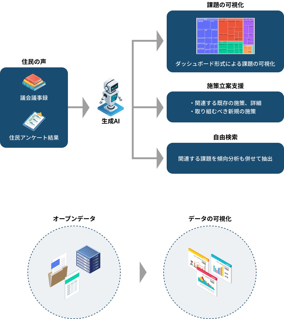 つくば市議会の会議録や洞峰公園、スーパーサイエンスシティなどに関する市民アンケートを基に、議会で取り上げられた課題や市民の考え等を生成AIで整理・分析、可視化するとともに、生成AIが課題等を要約し、新規施策を提案する機能を提供しています。