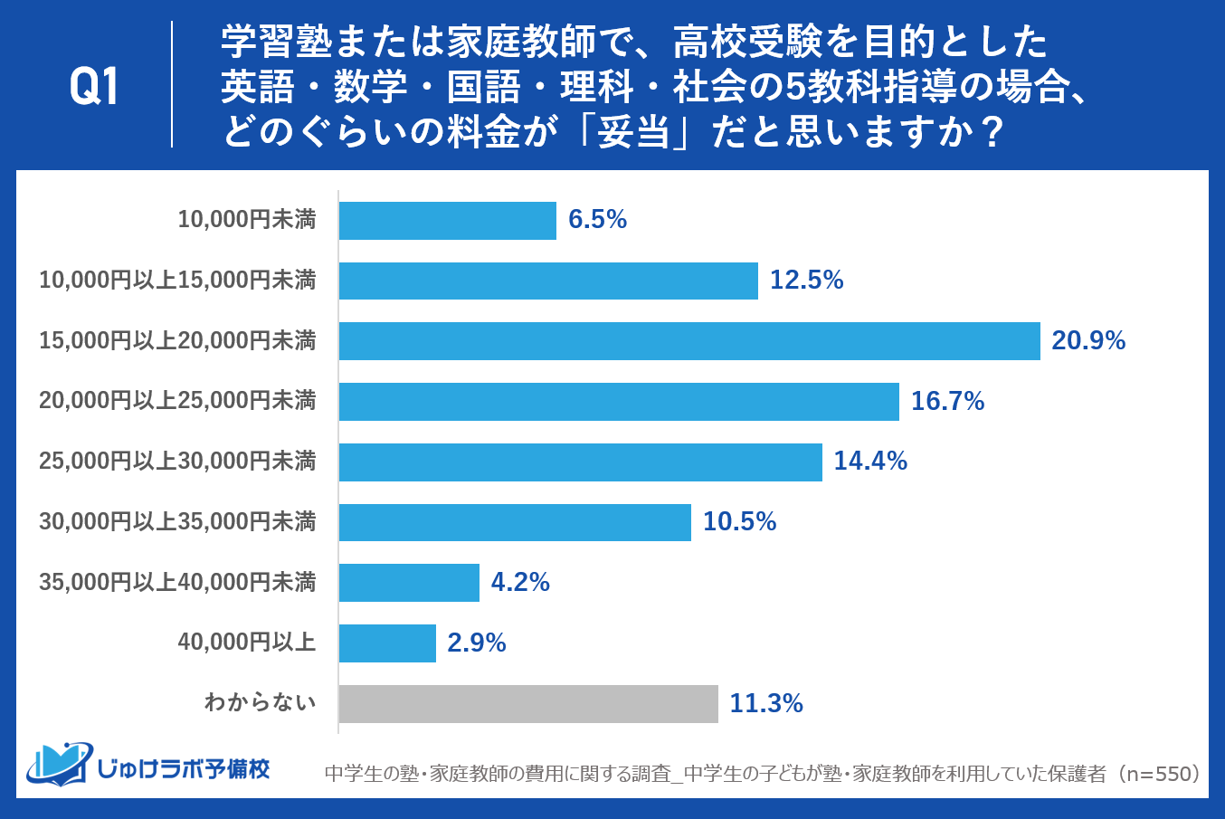 高校受験対策の5教科指導の場合、「妥当」と思う料金は15,000円~20,000円が最多