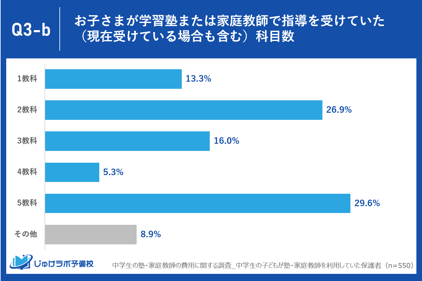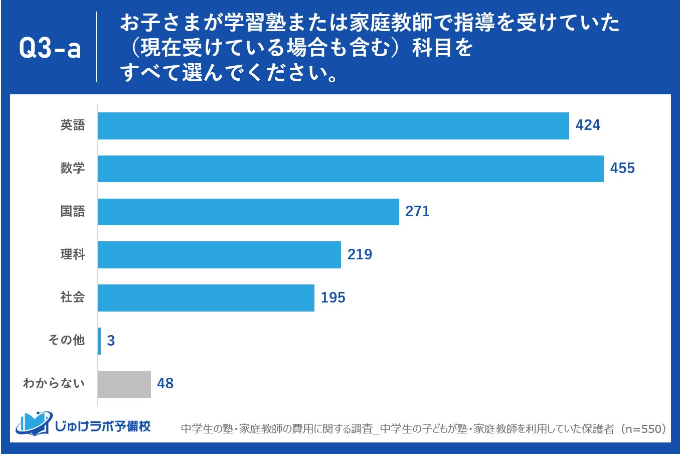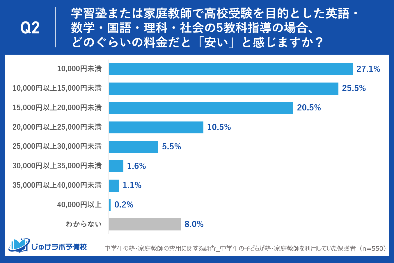 じゅけラボ予備校(所在地:大阪府大阪市北区 運営:株式会社エンライク)は、中学生の子どもが塾・家庭教師のいずれかまたは両方のサービスを受けたことがある保護者550名を対象に、中学生の塾・家庭教師の費用に関するアンケート調査を実施しました。