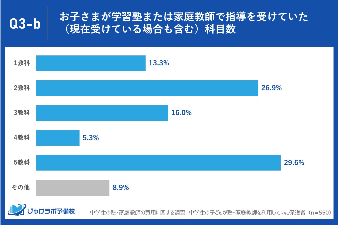 塾または家庭教師で指導を受けていた科目数は5教科が多数、次いで2教科が多い結果に