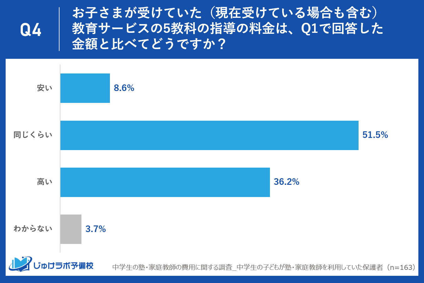 実際にお子さまが受けていた(現在受けている場合も含む)教育サービスの5教科の指導の料金が、Q1で妥当だと感じている金額と比べて高いか安いかの質問では、「高い」「同じくらい」と回答した人が87.7%で、安いと感じている人は少ない結果になりました。