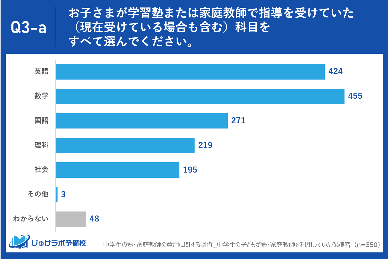 塾または家庭教師で指導を受けていた科目は英語と数学が多数