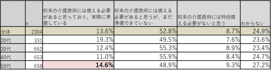 - 親の介護費用は「準備する必要があると感じながらも準備できていない」が半数以上。