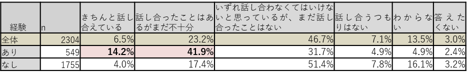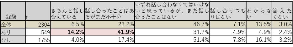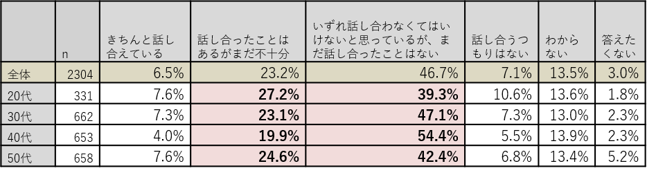 A. 「話し合ったことはあるが不十分」「まだ話し合ったことはない」合計で69.9%にのぼった。