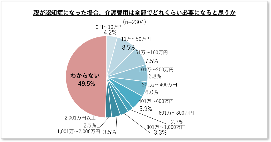 - 親の認知症介護にかかる費用について、約半数が「いくらかかるかわからない」。