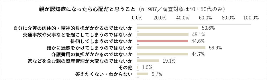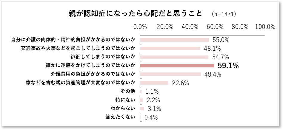 - 親が認知症になったときの不安の内容は「誰かに迷惑をかけてしまうこと」が最多。