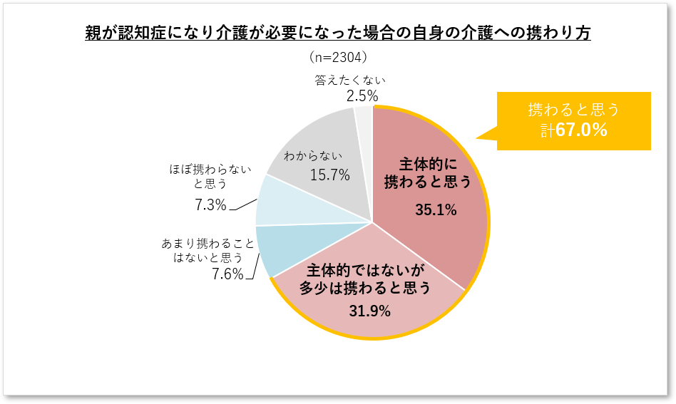 - 親が認知症で介護が必要になった場合、7割弱が介護に携わる意向ありと回答。