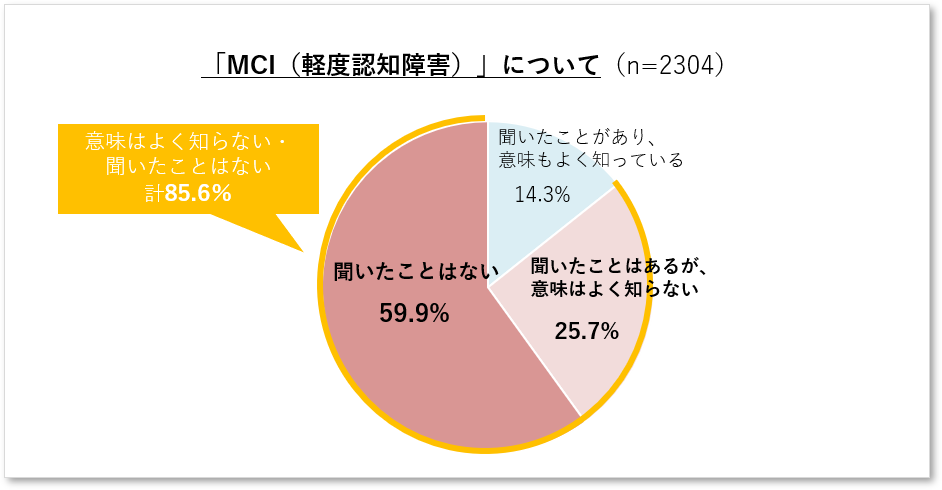 認知症の予防・重症化防止には、早期発見、とりわけMCI(軽度認知障害)の段階での気づき、予防に向けた取り組みが重要ですが、MCIの認知度は2割に満たないことも示されています 。
