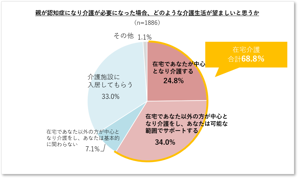 調査結果からは、多くの方が親御様の認知症になる可能性があると感じていることや、 親御様が認知症になり介護を必要とする状態になった場合には介護に携わることを想定している方が多いこと、介護生活としては施設介護よりも在宅介護を想定する方が多いことなどが明らかになりました。
